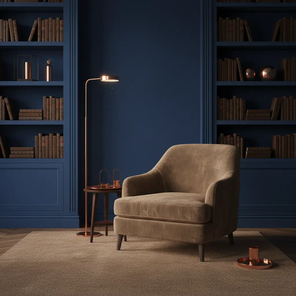• Navy Blue: Use it on textiles, throw pillows, and the back of built-in shelves.