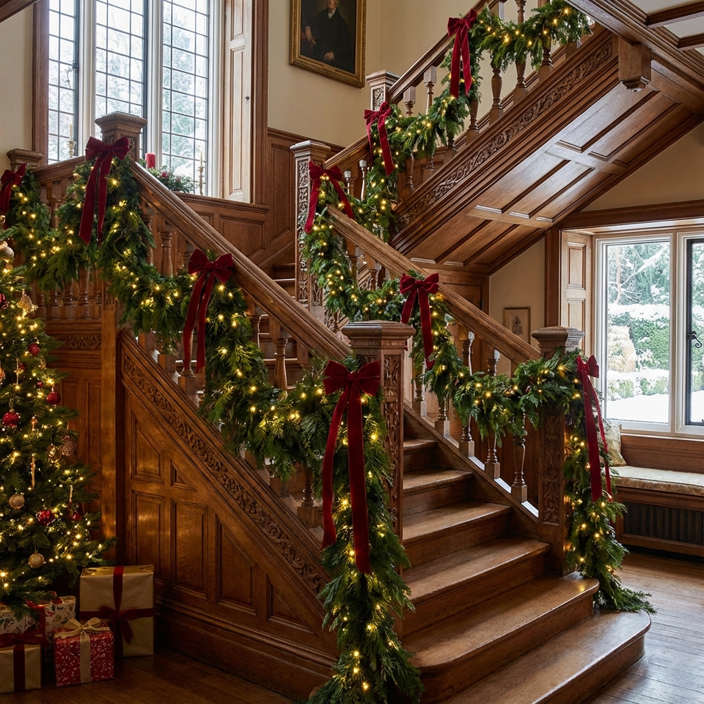 If you have stairs, you gotta wrap ’em. That’s the rule. This staircase got the full treatment: lush garland, red velvet bows, and fairy lights. It’s dramatic, it’s classic, and it’s slightly extra in the best way possible.