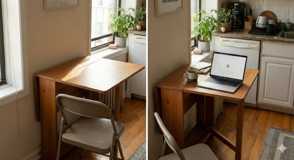 Now, go clear that “everything table” and give your laptop a proper home. Your brain and your dinner will thank you. Would you like me to help you create a specific floor plan or a shopping list for your small-space transition? 🙂